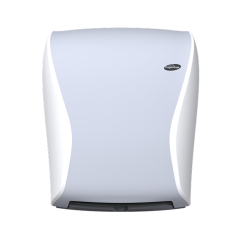 Locītu papīra roku dvieļu turētājs. Kompakts un izturīgs plastmasas korpuss, kas nodrošina ilgmūžību un vienkāršu apkopi. Regulējamā papīra padeve, kas garantē vienmērīgu un kontrolētu papīra izsniegšanu. Caurspīdīgā daļa sānā ļauj redzēt, kad pienācis laiks papīra dvieļu papildināšanai.
